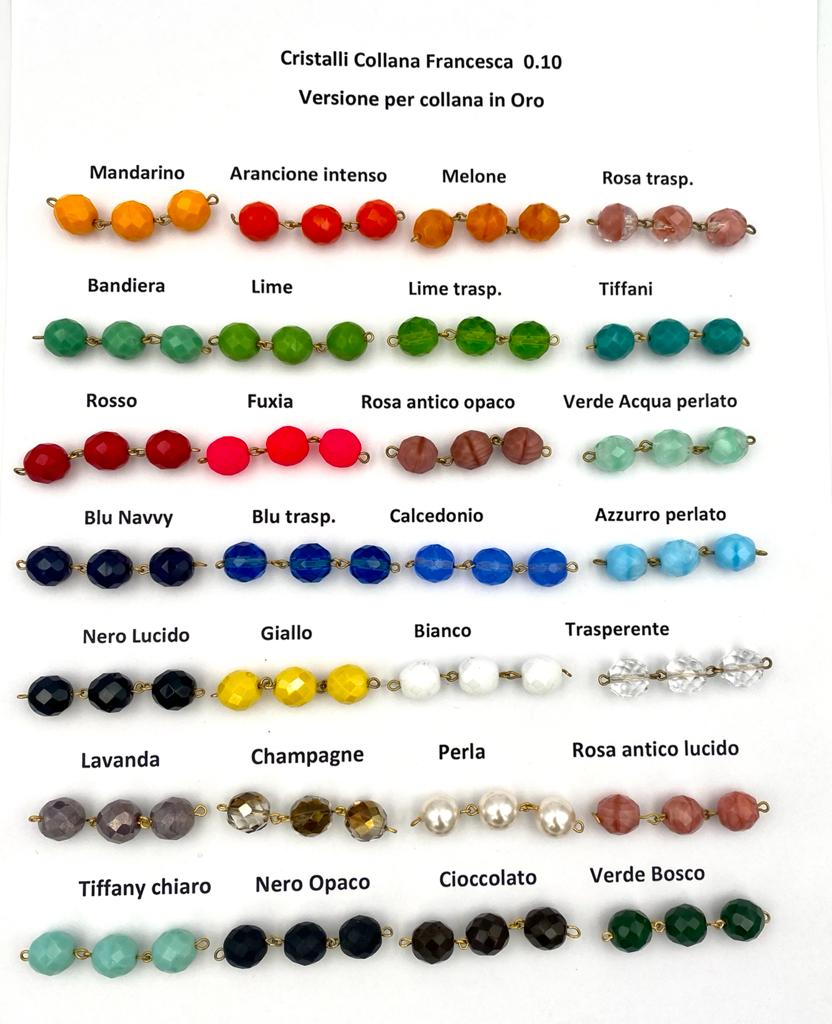 La catena è realizzata in alluminio anodizzato in colore oro, mentre i mezzi cristalli di vetro hanno un diametro di 1cm e sono incatenati tra loro a mano con anelli in ottone galvanizzato. Il ciondolo è realizzato in zama pressofusa.