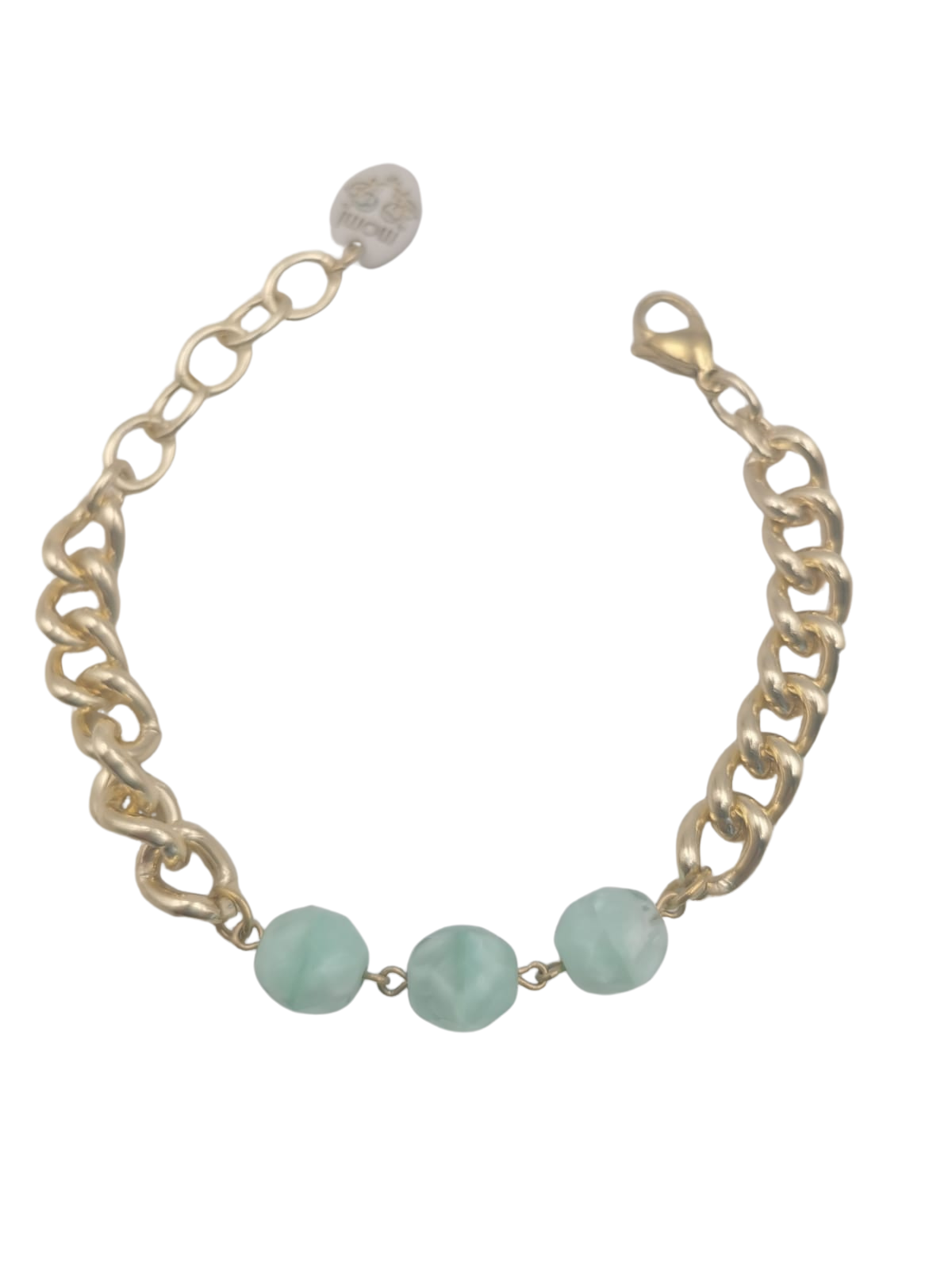 Il bracciale è chiuso da un moschettone in acciaio con l’inconfondibile ciondolo Momi in resina incisa.