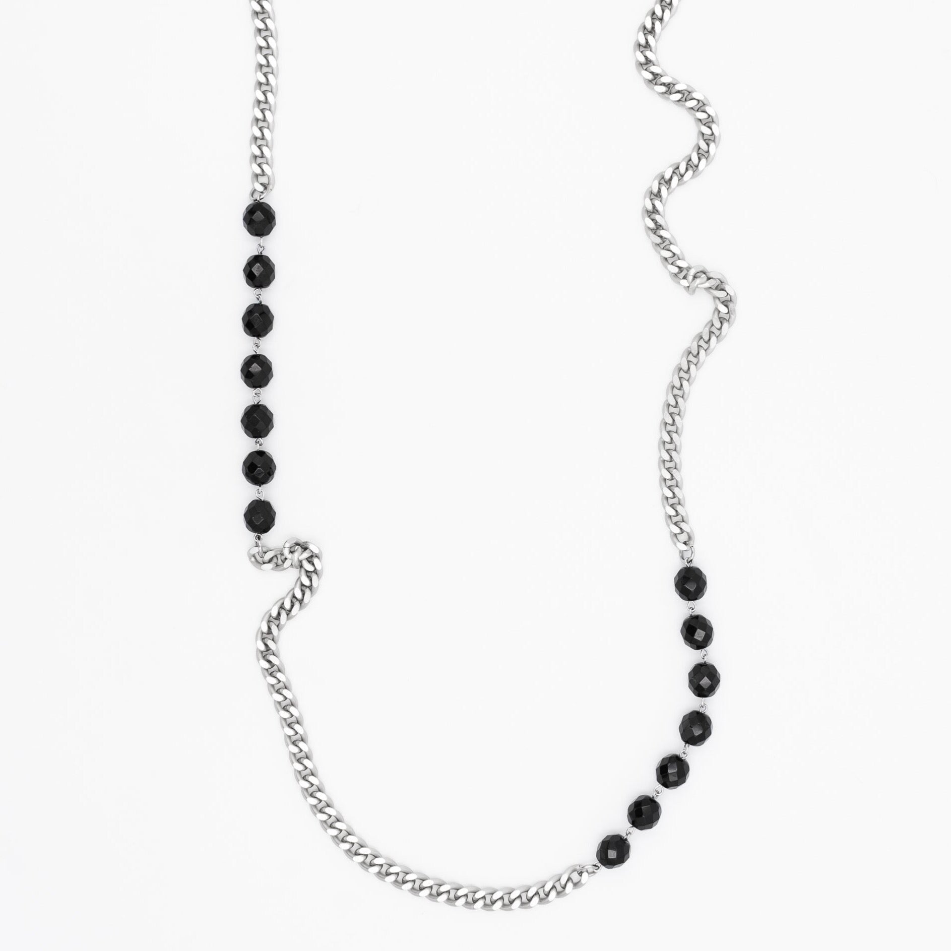 Collana lunga con cristalli. Disponibile in due colorazioni, la catena è realizzata in alluminio anodizzato con finitura oro o argento.